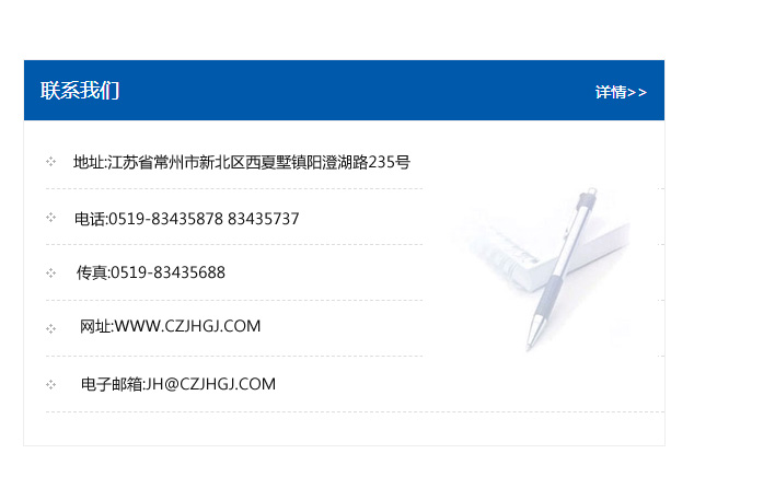 傳真:0519-83435688    郵編:213135    網址:WWW.czjhgj_com.szguangyi.com    電子郵箱:JH@czjhgj_com.szguangyi.com